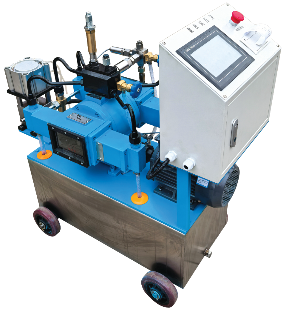 壓(yā)力試(shì)驗前,可先在觸摸控製屏上設(shè)定打壓壓力及保壓時間(jiān)。在觸控屏上點擊開始按鈕,試壓泵開始工作,隨著壓力上(shàng)升,達到指定壓力時自動停(tíng)止,進入保壓狀態。達到保壓時間後,觸摸屏上(shàng)的保壓時間分區會變紅提醒,可選擇手(shǒu)動泄壓或者氣控閥自動(dòng)泄(xiè)壓,試驗完成後,用微型打印機打印出試壓曲線。