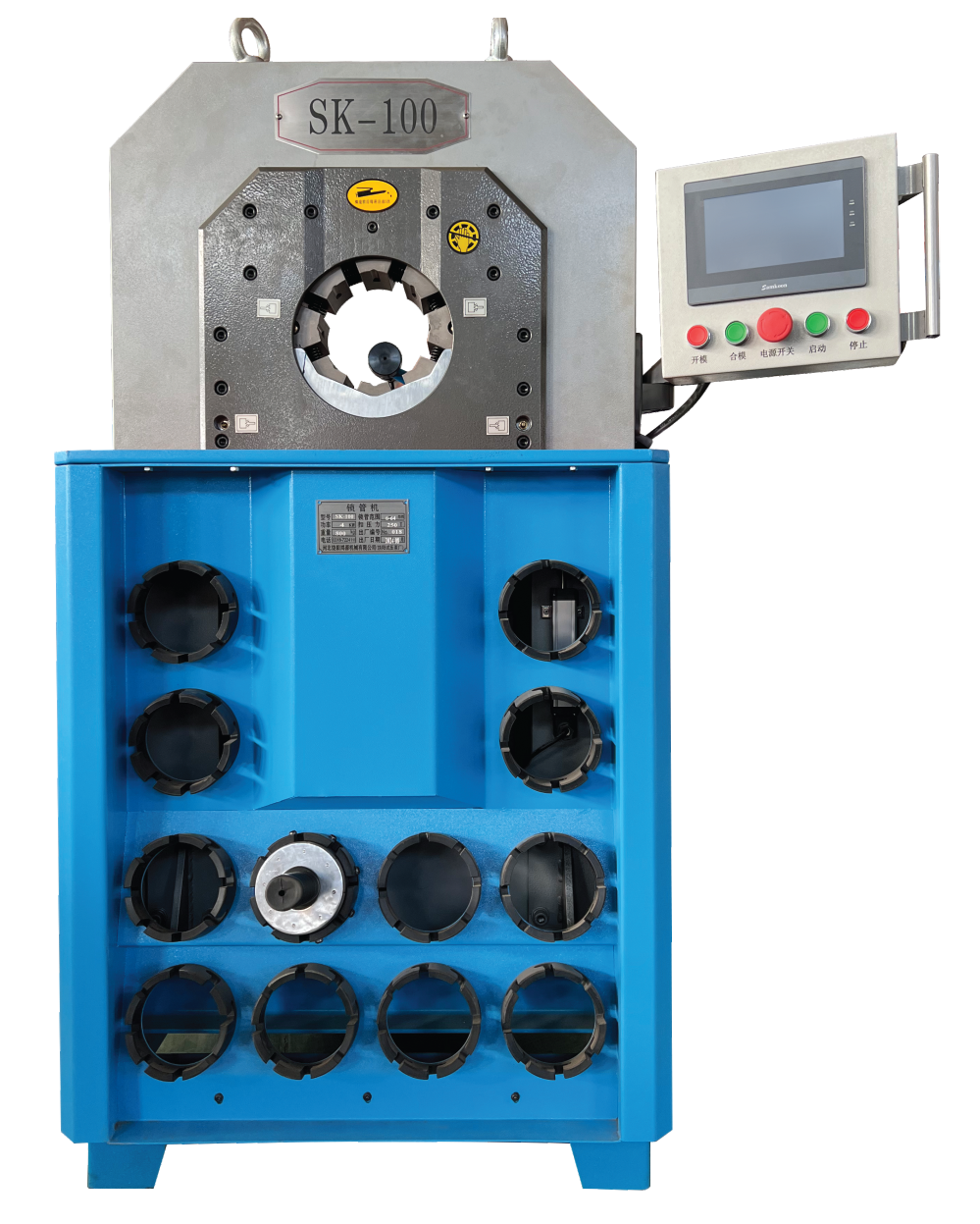 我(wǒ)廠研製生產的SK-100型鎖管機適用於工農業和工程機械液壓傳動用高壓膠管、纖維管、塑料管總成的扣壓加工。具有扣壓範圍廣、精(jīng)度高(采用PLC控製)、自動化程度高(gāo)、易操作、好維(wéi)修等優點。